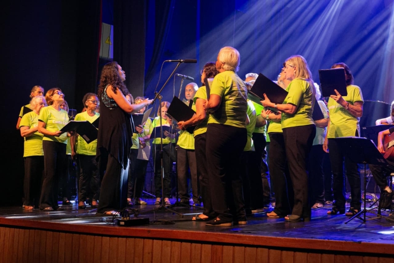 Com mais de 40 integrantes, em sua maioria idosos, o Canto Coral AMU é regido pela professora musicista Larissa Magrinelli Moreira. Durante a apresentação, o grupo compartilhou seu trabalho vocal com o público, reforçando a importância da música como ferramenta de convivência, expressão e bem-estar.